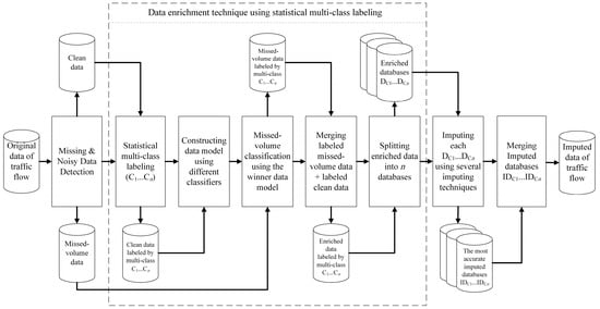In this phase, data are enriched by introducing an effective data enrichment technique shown in the dashed-line rectangle in Figure 3, in which the clean dataset is statistically labeled using class labels and subclass labels. Then, data models are constructed and assessed for accuracy. Missed-volume classification and merging of labeled datasets improve imputation accuracy. Finally, the enriched data are then split into datasets based on traffic classes for better data modeling in the imputation phase.