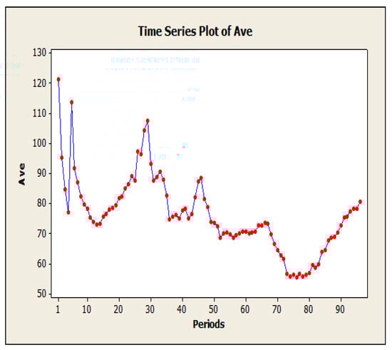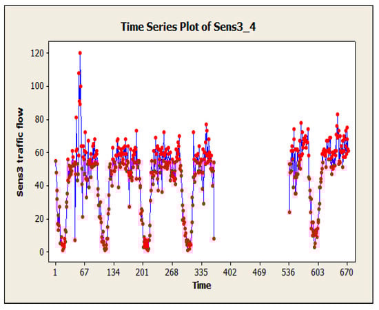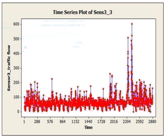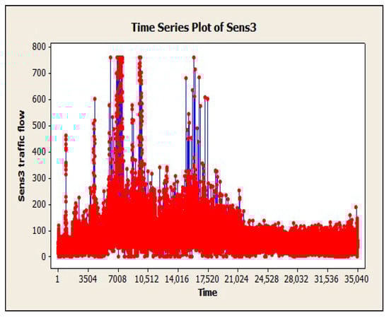Loop detectors generate non-stationary time series data including accurate, incorrect, and outlier data. Particularly, in SCATS intelligent traffic control system, incorrect data consist of “BAD”, “DA”, “-” which are considered as missing data. Missing data occurs when no amount of data is observed for the traffic volume variable and its record is not stored in the desired time interval. “DA” stands for detector alarm, which is generated when the system detects a fault or malfunction. “BAD” is an error that occurs when the sensor is in a saturated state, typically caused by being parked or obstructed by a physical object for an extended period. Finally, “-” indicates missing data when the sensor fails to transmit any data within a specific time interval. Researchers use different methods to detect missing values, including standard procedures in statistical software such as SPSS, or using specialized procedures provided in SPSS Missing Value Analysis (MVA) module []. Outlier data is an observation that lies at an abnormal distance from other values in a random sample of a population. Outliers include global, contextual, and collective data []. A global outlier is out of line with the rules of analysis of all traffic volume data for a detector. According to the existing and special conditions, contextual outliers are considered outliers. These data are only for a specific time period. A collective outlier is not generally considered out of data, but the dataset is outdated for the existing system.