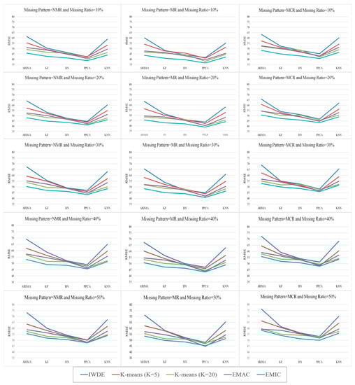 According to the missing pattern, missing data are divided into three categories: missing completely at random (MCR), missing at random (MR), and missing not at random (NMR) [,]. In the MCR category, the missing data appear completely independent as isolated points and are randomly distributed. In the MR category, the data are related to their neighboring points, so the missing data appear as a small set of consecutive points and at a particular time, which is a random distribution. In the NMR category, the missing data occur non-randomly throughout the dataset due to long-term errors in the detectors [].