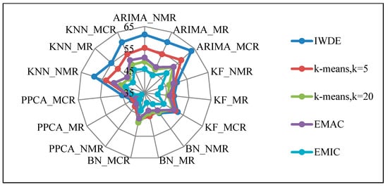 In statistical learning methods, such as probabilistic principal component analysis (PPCA) [,,], Bayesian principal component analysis (BPCA) [], Markov chain monte carol (MCMC) [], and ANN method [] use iterative methods to impute probability distribution parameters by considering the probability distribution of traffic data. These methods use the observed data to impute the missing data with acceptable values. Although imputing with statistical learning methods is simple and can be used for missing data in most applications, estimating traffic data’s temporal–spatial dependence is the main challenge []. Li et al. [] imputed missing values of Santa Clara traffic data over 43 days using different imputation methods. In their study, the participant methods were compared in terms of statistical behaviors, execution speed, and reconstruction errors. The obtained results show that when the percentage of missing data is high, the PPCA method is more efficient than the nearest neighbor and LLS method in terms of execution speed. In addition, since the nearest neighbor methods, LLS, and PPCA methods have good statistical features, they are recommended more than predictive methods and MCMC when the percentage of missing data is high.