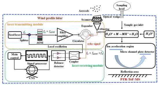 The data acquisition system comprised an all-fiber CWML system and a PTR-TOF-MS system. The experimental setup was installed on a 5.5 m long Iveco station wagon equipped with an operator’s console and a power supply system. The system schematic diagram is shown in Figure 1.