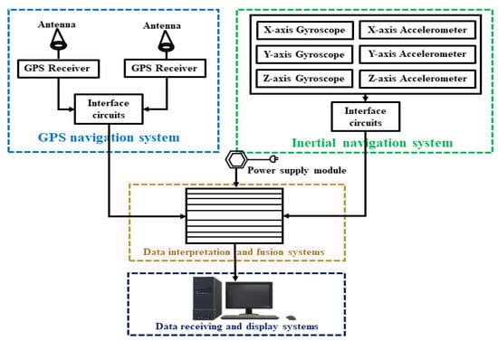 In this study, we used a pulsed CWML system manufactured by Technovo Lidar High Tech Co., Ltd., Hefei, China (model KC-WL-2006 Lidar) [30]. The Lidar system is divided into two sub-systems: laser-transmitting system and laser-receiving system. In this study, the transmitting and receiving modules of telescope are integrated, which could be used to adjust focus. The seed laser produces a narrow linewidth laser with a wavelength of 1.55 µm. After beam amplification, collimation, and beam expansion, the laser is emitted into the atmosphere using a scanner at specific azimuth and elevation angles. Multiple laser “lines” are formed by rotational scanning, thus enabling 3D scanning of the detection area. The transmitted laser experiences Mie scattering in the atmosphere, and the receiving telescope receives the backward-scattered light. Next, the light received by telescope is collimated into parallel light through the optical fiber and reflecting telescope and then converted to photoelectric signal via balance detector. Finally, the data are collected by the acquisition card and stored in the computer. The whole system ensures the coordination of laser transmission and reception, data acquisition, and processing under the control of the computer. The Lidar optical skylight was installed with special optical glass for mobile Lidar operations. The Lidar was placed on a special frame to keep the instrument stationary and reduce the impact of vehicle movement (see Figure 2). Specifically, the vehicle-mounted system hosted a CNS, which consisted of two high-precision GPS antenna, an accelerometer, and a gyroscope (see Figure 3). The first GPS (i.e., the Lidar GPS) was located on top of the Lidar special frame, while the second GPS (i.e., the vehicle GPS) was located on the bottom of vehicle structure, to enable the measurement of the vehicle and Lidar attitude.