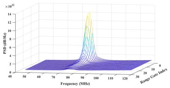 The system is compact with a size of 835.0 mm × 550.5 mm × 888.6 mm, and mass of 50 kg. A laptop or PC is used to control the Lidar and store the measured data in each azimuth angle. Moreover, the laser emits a beam with 1.55 µm wavelength, where the pulse energy is 145 µJ. The single-pulse energy is limited. Noncoherent integration of echo signals is required. The spectral accumulation number is 20,000. The pulse width is τ = 400 ns, which corresponds to distance resolution of R = c × τ/2 = 60 m. The sampling frequency is fs = 1 GHz, and N = 1024 points Fast Fourier Transform (FFT) is performed on this signal, so the spectral resolution f = fs/N = 0.98 MHz. To simplify the analysis, a valid section of echo signal power spectrum containing the peak value was intercepted for analysis, i.e., each range gate contained Np = 112 valid points after the interception. In addition, the first 128 range gates were retained, i.e., 14,336 data were collected for subsequent analysis in each radial direction. The power spectrum data is shown in Figure 4 (only the first thirty range gates are shown). The X-coordinate represents frequency, the Y-coordinate represents range gate index, and Z-coordinate represents power spectral density (PSD). The first range gate stores noise data, and the second and third range gates store the mirror data. The mirror data are formed by the reflection and refraction phenomenon of the telescope system itself. The data in the 4th to the 128th range gates are valid data. The CNR is an important index used to detect the performance of Lidar. For a CWML system featuring a real-time signal processing function, the CNR is usually estimated from the average PSD data in the frequency domain. Moreover, the frequency-domain wideband CNR of the signal is defined as the ratio of the integration of signal PSD to the integration of noise PSD. As suggested by Manninen et al. [31], this study used a CNR of −20 dB as a threshold. After FFT, if the CNR of range gate is below the threshold, the data of range gate will be rejected. During experiments, the conical scanning is conducted with four lines of sight in a step-and-stare mode with a period of 10 s. The wedge scanner rotation speed was 180 degrees per second. The settling time was 2 s. The azimuth angle changed from 0° to 360°, with an angle step of 90°. Accordingly, the laser beams were pointed at four azimuths, north (0°), east (90°), south (180°), and west (270°), with an elevation angle of 60°. Many people were on duty in rotation. The vehicle-mounted Lidar operates at 30 km/h, ensuring at least two hours of detection time each morning, afternoon, and evening. The wind profile Lidar parameters are shown in Table 1.