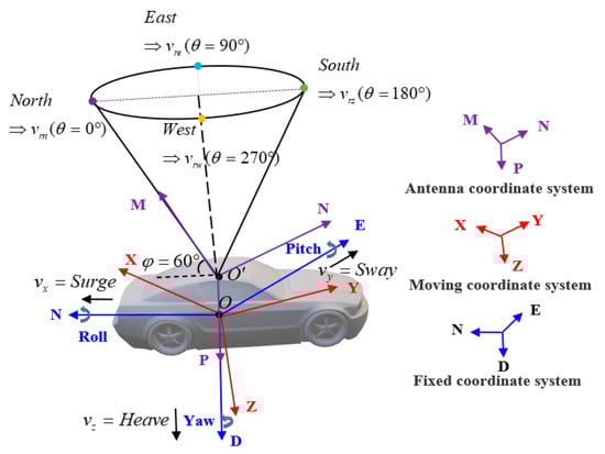 In this study, a new CNS was equipped to measure and provide the running speed and attitude angle data at any time during the navigation monitoring experiments for real-time correction of the errors [29]. After the signal processing module processes these data, the line of sight is corrected in real time. The dual GPS difference is used to determine the attitude angle data of the vehicle-mounted platform, and the average of the motion velocities measured by the dual GPS is used as the motion velocity of the vehicle-mounted platform. When one of the GPS signals fails to be received, it is supplemented by observations from the INS, which are fed into the algorithm as measurements of the motion error. To describe the vehicle-mounted system, we define the right-handed Cartesian XYZ moving coordinate system (referred to as the M-system) of the vehicle-mounted platform and the north–east–down right-handed Cartesian NED fixed global frame of reference (referred to as the F-system) (see Figure 5). In addition, we also define the right-handed Cartesian MNP antenna coordinate system (referred to as the A-system). The origin of coordinates is defined as the antenna center, M-axis is along the optical axis of the radar antenna, and the N-axis is perpendicular to the M-axis. In real operating conditions of CWML, external forces cause a translational motion in the N, E, and D directions (surge, sway, and heave, respectively) and a rotational motion along the N, E, and D axes (roll, pitch, and yaw, respectively) [35]. The changes in running speed and attitude angle of the vehicle platform are represented by the four parameters: real-time operating speed, roll, pitch, and yaw. Moreover, motion compensation (MC) is divided into two parts: attitude compensation [36] and speed compensation [37].