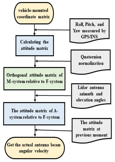 The flowchart of the attitude compensation algorithm is shown in Figure 6. Firstly, the attitude angle measured by GPS/INS is substituted into a transformation matrix to obtain the attitude matrix of the M-system relative to the F-system. Here, the elements in the matrix are functions of yaw angle, roll angle, and pitch angle. Next, the attitude matrix is normalized by using the quaternion method. Progressively, the attitude matrix of the A-system relative to the F-system is derived from the azimuth and elevation of the antenna beam, where the elements of the matrix are functions of azimuth and elevation angles. In this way, the attitude matrix of the A-system relative to the F-system is obtained. Finally, the antenna beam’s actual azimuth angle and elevation angle are obtained by comparing the azimuth and elevation of the two adjacent moments. The advantages of the above attitude compensation algorithm are, on the one hand, the attitude and orientation data of the vehicle platform observed by the CNS are input to the signal processing system in real time; on the other hand, the algorithm as an algorithm module can be integrated into the signal processing system without the influence of any mechanical equipment, which is more efficient and stable compared to the adjustment platform of the antenna.