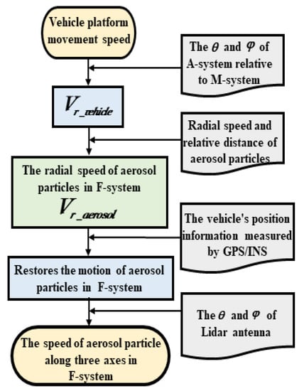 The corresponding algorithm flowchart is shown in Figure 7. Initially, the running speed of the vehicle-mounted platform is measured in the F-system using the CNS. Moreover, the azimuth and elevation of the radar antenna relative to the M-system are obtained from the observation data. The radial running speed of the vehicle platform is calculated based on the speed, azimuth angle, and elevation angle. Then, the aerosol particles’ radial speed and relative distance are obtained from the observed data. Furthermore, the actual radial speed of the aerosol particle is calculated, and the actual position of the aerosol particle and the angle matrix along the three axes are calculated in the F-system by coordinate transformation. Finally, the speed of aerosol particles along three coordinate axes is obtained in the F-system.