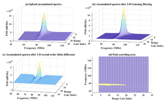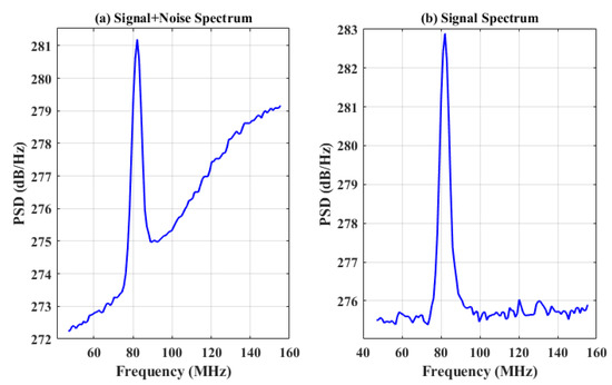 Suppression of the base noise plays an essential role in the spectral processing of CWML to accurately estimate the radial wind speed. If the base noise is ideally white and has a known average level, it is easy to reduce. However, the base noise is colored due to the frequency gain characteristics of the electrical receiver circuit. In addition, the average noise level varies according to the scattered noise level. Empirically, the scattered noise level constantly fluctuates, as the base noise can quickly fluctuate depending on the ambient temperature. In our processing, the CWML recorded the noise spectrum without any received signal when the laser was stopped and subtracted the noise spectrum from the received signal spectrum. For each range gate signal, the base noise signal was subtracted (counterpoint subtraction) and the mean value of the base noise was added, and the resulting spectrum is a flat-base spectrum, as shown in Figure 8. This process whitens the base noise and helps the correct signal peak to be detected. Subsequently, the spectra were smoothed according to the method proposed by Lin et al. for estimating radial wind from smoothed accumulated spectra [39]. Examples of intermediate results are shown in Figure 9.