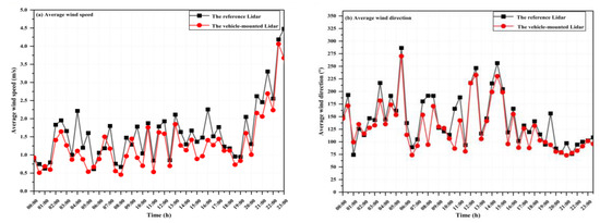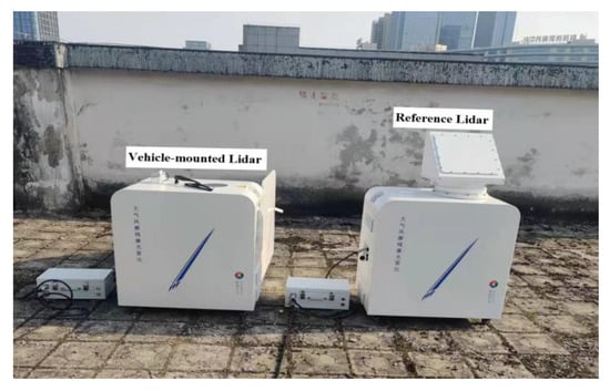 In this study, calibration tests in the static state for both vehicle-mounted CWML and a reference Lidar (the fixed Lidar) were carried out. The Lidars were set to simultaneously measure the wind field under static conditions. The reference Lidar (KC-WL-2004) has the same specifications as those of the KC-WL-2006. The reference Lidar (KC-WL-2004) was verified through a verification test with a radiosonde. In addition, the calibration experimental site was selected on the roof of block C4 in the Innovation Industrial Park (117.12°E, 31.85°N). The two Lidars were kept five meters apart to ensure identical measurements on a 30 min time basis (see Figure 12). Vertical wind profiles were observed for 24 h from 00:00 on 29 July to 00:00 on 30 July in 2021, to study the stability of the vehicle-mounted CWML system.