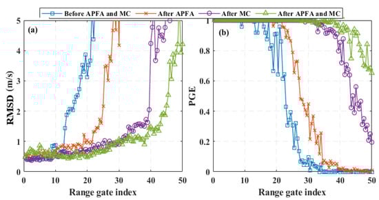 The second criterion was the proportion of good vector estimates (PGE), where the m/s was chosen as the threshold. As shown in Figure 15 “Before APFA and MC” refers to the processing results of the accumulated spectra mentioned in Section 2 without applying APFA and MC. Similarly, “After APFA” refers to the processing results after applying the APFA. “After MC” refers to the processing results after applying the MC. “After APFA and MC” indicates the processing results after applying APFA and MC. It can be seen from Figure 15a that the RMSDs of the estimated wind vector increased gradually with the increase in detection distance. The application of APFA plays a vital role in the wind vector estimation process, increasing the detection distance by about 500 m. The effective detection height of Lidar could reach 3 km. Furthermore, the vibration of the vehicle platform interferes with the cone scan, resulting in a broadening of the spectrum and confusion in the beam pointing. Here, the application of motion compensation dramatically improved the detection accuracy and detection distance. The case “After APFA and MC” achieved the best result, where the RMSD remains at a low level. Meanwhile, “After APFA and MC” is also the best for PGE (see Figure 15b). Notably, the PGE of the “Before APFA and MC” dropped to 90% at the 17th range gate. Evidently, “After APFA” performed better than “Before APFA and MC”, and its PGE dropped to 90% at the 23rd range gate. In addition, the PGE of “After MC” method dropped to 90% at the 43rd range gate. Thus, APFA and MC are proven to be effective for Lidar on a moving platform.