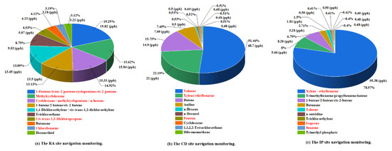 Case 3: On 5 August 2021, at around 2:00 p.m., navigation monitoring was conducted downstream of the IP of Shushan District, Hefei. Among the VOCs (Figure 22c), xylene/ethylbenzene was the most abundant substance at the IP site, accounting for 78.97% of the total top ten. This can be attributed to the presence of rubber and paint factories, where xylene/ethylbenzene is used as an essential chemical material in the production of rubber and paint. Meanwhile, VOCs such as aldehydes and ketones, which are products of the oxidation of hydrocarbons, can be detected in high quantities downstream of the contaminated area. The three case studies above show that the concentrations and compositions of VOCs have regional characteristics.