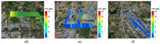 VOCs navigation monitoring: (a) 4 August 2021 16:30–17:00; (b) 4 August 2021 17:30–18:00; (c) 5 August 2021 00:30–01:00; (d) 4 August 2021 16:30–17:00; (e) 4 August 2021 17:30–18:00; (f) 5 August 2021 00:30–01:00.