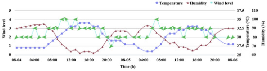 Variation trend of temperature, humidity, and wind level over time from 0:00 on 4 August to 0:00 on 6 August 2021.