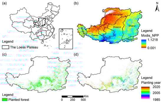 Geographic location and planted forest map of the Loess Plateau: (a) general location in China; (b) NPP data from the MODIS sensor on 1 January 2021 from Google Earth Engine (GEE) imagery; and the spatial distribution of (c) planted forest and (d) planting year.