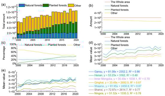 The changes in NPP within planted forests, natural forests, and the entire Loess Plateau region: (a) the total amount of NPP change, (b) the number of pixels affected by the change, (c) the percentage of NPP change relative to the entire area, (d) the mean valve of NPP, and (e) the change trends of NPP in different provinces.
