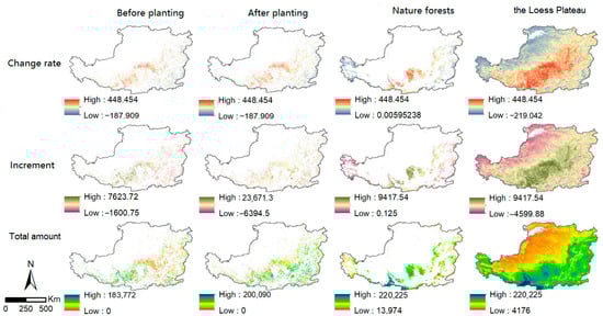 Spatial distributions of NPP change rate, increment, and total amount before planting, after planting, in natural forests, and in the whole Loess Plateau region.