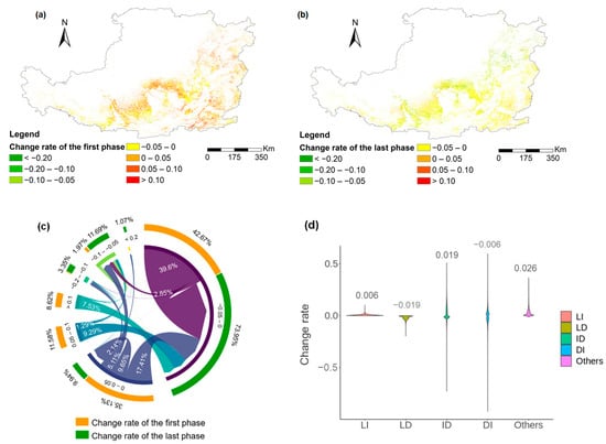 Change rate of planted forest variability: (a) slope of the first phase in all change patterns, (b) slope of the last phase in all change patterns, (c) chord diagram of slope from the first phase to last phase, and (d) raincloud and average of slope of all change phases in five change patterns.