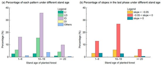 Percentage of each pattern (a) and slopes in the last phase (b) for different stand ages of planted forests.