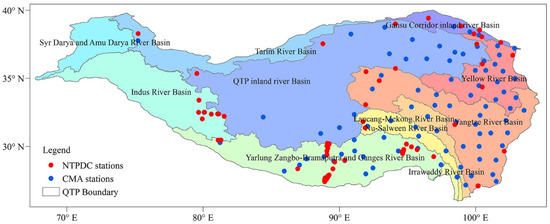 Location of observation stations in the QTP (Different colors represent different river basins).