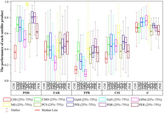 Performance of satellite products at detecting precipitation occurrence at the observed stations (the abbreviation of each product is shown in Table 1).