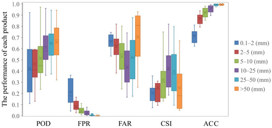 In the A′-based evaluation, there was no substantial variation in the performance of satellite products at different levels of precipitation. Standard deviation estimated from the mean A′ of each SPP was within 0.05. The SPPs had the weakest performance at capturing precipitation occurrence at the level of 0.1–2 mm, with the median and mean A′ of all products being >0.70 and >0.60, respectively. All SPPs showed a strong ability to capture precipitation occurrence when precipitation was >10 mm, especially for heavy rain and rainstorm, with the mean A′ of each product ranging from 0.98 to 1.00. The evaluation results of the FPR were consistent with those of the A′ index.