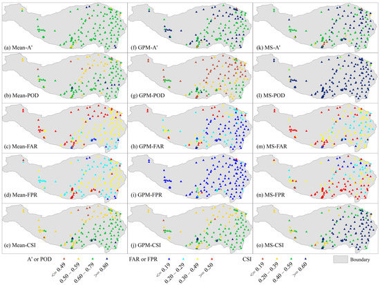 MSWEP showed a strong ability to capture the occurrence of precipitation. The POD at most stations (155/161) was >0.80. The number of stations (91/161) with CSI values >0.60 was also much higher than for the other products, especially in the eastern QTP. However, MSWEP also showed a high false alarm rate/ratio. The spatial distribution of MSWEP in the evaluation of A′ was consistent with that of GPM.