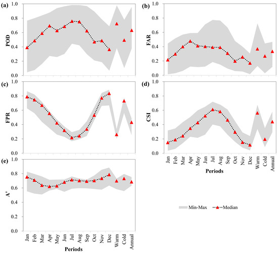 Performance of SPPs at detecting precipitation occurrence during different periods ((a–e) are the performance of SPPs evaluated by the POD, FAR, FPR, CSI, and A′, respectively. Min and Max are minimum and maximum values, respectively).