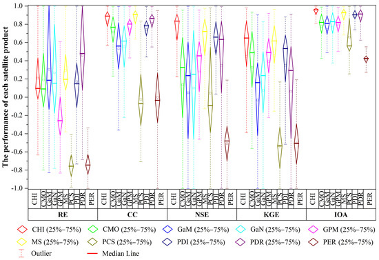 The CHIRPS measurements were in good agreement with the observed precipitation in the QTP, with a mean NSE at 0.65. Measurements of the PDIR-Now and MSWEP also matched well with the observed values, with the mean NSE values of the two products being 0.51 and 0.50, respectively. However, the other products showed relatively poor agreement with monthly precipitation, with the mean NSE being <0.35 in each product. The SPPs showed poor performance in the evaluation of KGE, with the mean value of KGE being only 0.40. MS and CHIRPS showed the strongest performance, with KGE > 0.50 at approximately 63% of the stations. The variation in the products among stations evaluated using IOA was substantially smaller than that evaluated using the other four indices. CHIRPS showed the strongest performance, with IOA > 0.80 at 89% of the stations. MSWEP, PERSIANN-CDR, and PDIR-Now also showed better performance, with the IOA > 0.80 at 86%, 87%, and 80% of the stations, respectively.