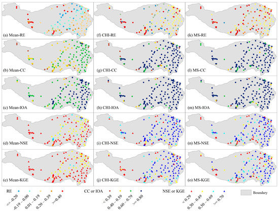 Evaluation criteria for simulating monthly precipitation series included Pearson’s correlation coefficient (CC), index of agreement (IOA), Kling–Gupta efficiency (KGE), Nash-Sutcliffe efficiency (NSE), and relative error (RE) [90,91,92,93]. The IOA and NSE evaluate the goodness-of-fit of the simulated and observed data series. The RE represents bias deviation from the observed values. The KGE is an evaluation index that integrates the CC, RE and standard deviation. The evaluation criteria were calculated as follows:
