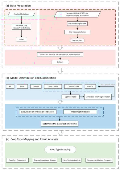 In particular, we focus on addressing the following research questions: (1) Is the performance of polarimetric decomposition features from dual-polarization SAR data sufficiently competitive when compared to the commonly used backscatter coefficient? (2) How efficiently do CNN, RNN, and their combination perform in this context? (3) Can patch-based methods effectively improve accuracy compared to pixel-based methods? The technical roadmap is shown in Figure 1.