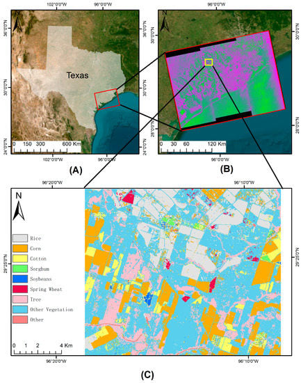 Location of the study area. (A) Location of the Single Look Complex (SLC) data in Texas, (B) composited SLC data on 10 January 2020 (RGB corresponds to Alpha, Anisotropy, and Entropy, respectively), and (C) the study area along with the map crop types.