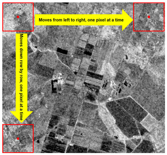 Referring to existing research experiments, patch sizes of 1, 3, 5, 7, 9, 11, 13, 15, 17, 19, and 21 pixels were tested to determine the most suitable size. A patch size of 1 represents a pixel-based method. Figure 4 illustrates the schematic diagram of patch composition. The experiments involved moving the window from the image’s top-left corner of the image to the bottom-right corner, row by row, at the pixel level, as shown in Figure 5. Each patch overlapped with the subsequent pixel, thus capturing maximum information. The final result was a four-dimensional patch of time × width × height × channel, with the patch class corresponding to the central pixel’s class, as depicted in Figure 6 and Figure 7.