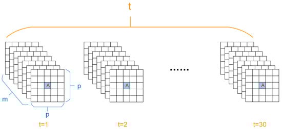 Schematic diagram of the dataset utilizing a patch-based strategy. Pixel A denotes the central pixel, with the remaining pixels comprising its surrounding area. In this example, the patch size is 5. P signifies the width and height, equal to the patch size, while m represents the number of channels, and t corresponds to the number of time periods.