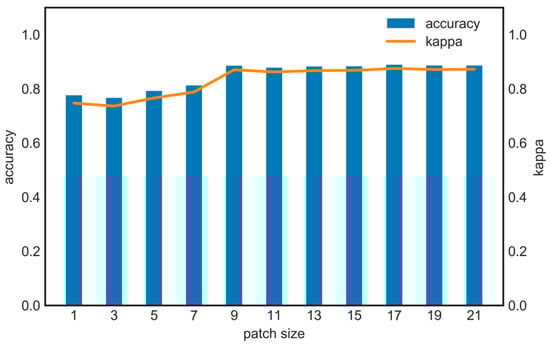 The impact of different patch sizes on the test dataset’s accuracy and kappa value when using the Conv3d classifier.