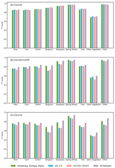 Comparing the F1 scores for each category using different features (Figure 10), it is found that Anisotropy, Entropy, and Alpha can improve the classification of ambiguous categories such as “Sorghum” and “Soybean”. However, the performance of polarization decomposition features for “Other Vegetation” remains unsatisfactory. It is hypothesized that while these features improve differentiation from the main crops, they concurrently decrease distinction from trees. In the backscatter coefficients, the difference between this category and “Tree” is obvious. Therefore, the classification based on all features can achieve the best results.