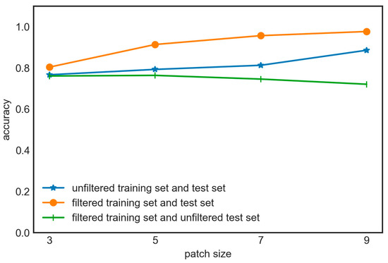 Effect of filtering strategy on classification results across various patch sizes.