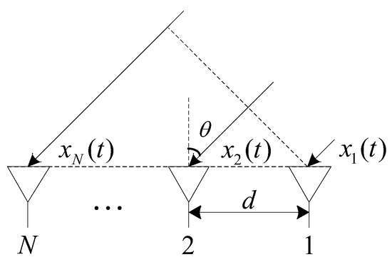 In order to simplify the analysis without loss of generality, under the far-field condition, it is assumed that a single navigation signal and interference signal occur on the uniform line array (ULA) simultaneously. The ULA has antenna elements. The array configuration of the ULA is shown in Figure 1.