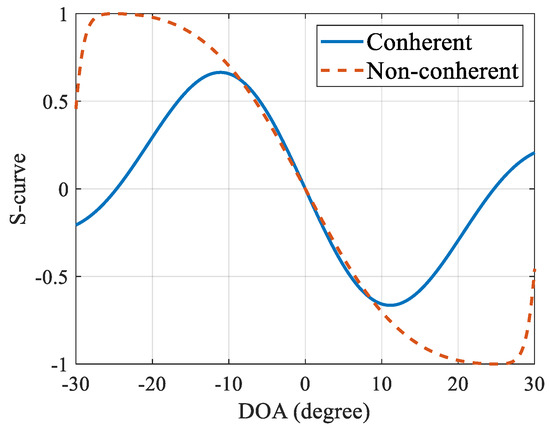 The S-curves of the coherent DiLL and non-coherent DiLL are shown in Figure 3, in which and . As can be seen from Figure 3, the differential curve shows an approximate linear change near 0 degrees, so the DOA estimation error can be corrected by the discriminator. It also shown that the convergence of the non-coherent DiLL is larger than that of the coherent DiLL.