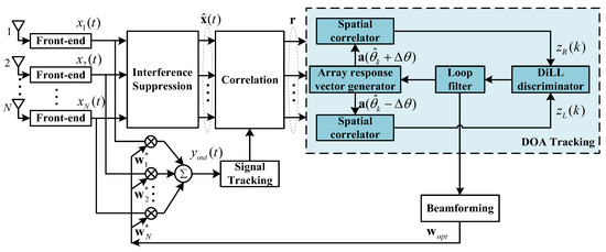 In Ref. [23], DiLL is used for the DOA estimation of mobile target, which can achieve a high-resolution DOA estimate signal. In Ref. [24], a DOA tracking method based on DiLL with tracking bias compensation for GNSS receivers was proposed, in which the tracking bias was effectively eliminated by estimating and compensating the error in real time. In Ref. [22], the rotate-to-zero DiLL (RZ-DiLL) method was proposed, which could effectively improve the DOA parameter estimation accuracy of large-angle incident signals. In Ref. [25], a DiLL method for a three-element L-shaped array was proposed to achieve the fast acquisition and tracking of two-dimensional DOA parameters, which significantly simplified the antenna structure and eliminated the dead-zone effect. However, most of the above methods are only suitable for non-interference scenarios. The realization of DOA tracking in strong interference scenarios is in urgent need of research.