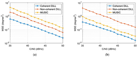 In this section, the performance of the DOA estimation is evaluated by Monte Carlo simulation. The Monte Carlo simulation was performed 1000 times; and . Figure 5 shows the MSE results of the DOA estimation under different carrier-to-noise ratios () and different array elements. The performances of the coherent DiLL method, non-coherent DiLL method, and MUSIC method are compared and analyzed. As can be seen from Figure 5, the accuracy of DOA estimation is higher with the increase in the . Under the same condition, the more array elements there are, the higher the estimation accuracy. When the number of array elements is small, the DiLL algorithm can achieve better performance than MUSIC, mainly because when the number of array elements is small, the resolution of the MUSIC algorithm is significantly reduced, while the loop tracking method can still achieve high-precision tracking results. With the increase in the number of array elements, the performance of the MUSIC algorithm is improved and the DiLL algorithm is also effectively improved. Therefore, when the number of array elements is small, the DiLL algorithm has better advantages. It can also be seen that the performance of the coherent DiLL method is better than that of the non-coherent DiLL algorithm.