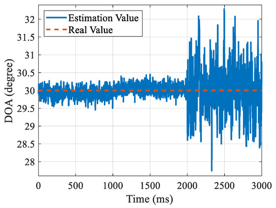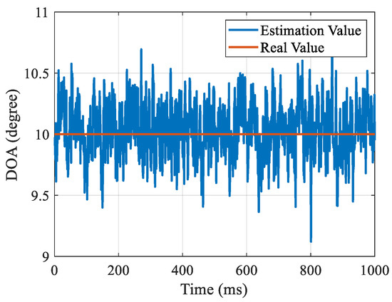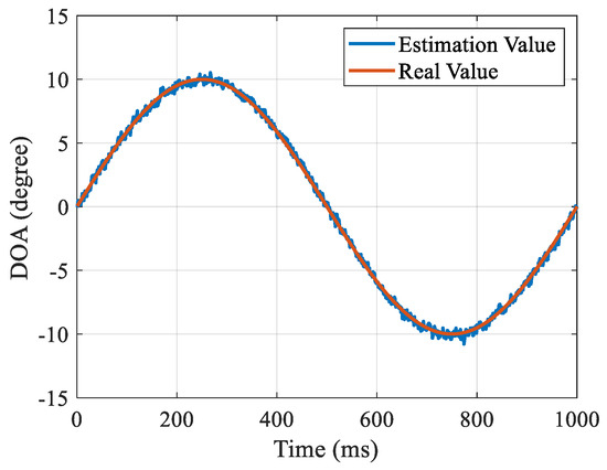 Figure 6 shows the tracking results under fixed DOA conditions. In this scenario, the DOA parameter is a fixed value of 10°. The tracking results under the condition of uniform acceleration of DOA are given in Figure 7. The change rate of DOA is 20°/s2, and the angle range is −10–0°. Figure 8 shows the tracking results under the condition of sinusoidal variation in DOA. The variation period is 1 s and the variation range is −10–10°. Figure 9 shows the tracking results under the condition of DOA step change, and the DOA step is 10°. When there is a step change in the DOA, the tracking loop needs to converge to a new parameter. Therefore, the DOA error may increase in several loop update cycles. The DOA tracking errors in the above four scenarios are 0.053, 0.054, 0.06, and 0.11, respectively. The simulation results show that the DiLL method can adapt well to the DOA tracking problem in different dynamic scenes.