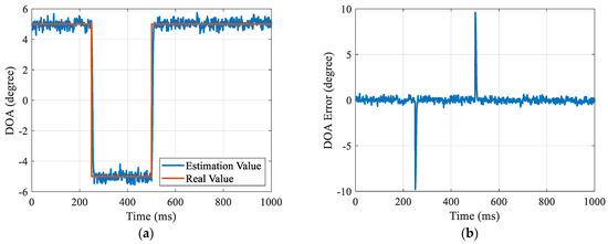 Tracking results in the scenario of DOA parameter step change: (a) DOA tracking results; (b) DOA tracking error.