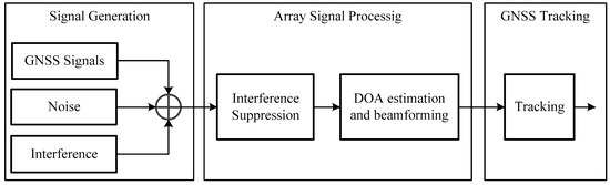The simulation module, which consists of three parts including the signal generation module, array signal processing module, and GNSS tracking module, was used to verify the efficacy of the algorithm. Figure 10 illustrates the simulation module. The signal generation module is used for simulating the array receiver signals. Specifically, the GNSS signal vector, interference signal vector, and noise signal vector were simulated individually, and then combined to form the received signal. On the other hand, the array signal processing module were mainly used for interference suppression, DOA estimation, and beamforming. After array weighting, the GNSS software-defined receiver [27] was used for GNSS signal tracking.