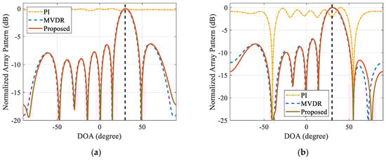 Normalized array patterns of the proposed method, the PI method, and the MVDR method: (a) no-interference scenario; (b) interference scenario.