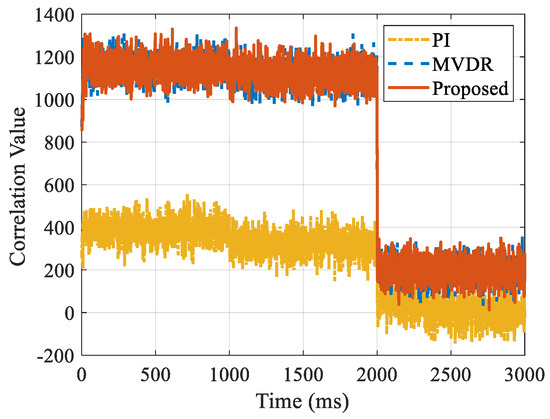 In the simulation, one satellite navigation signal and two interference signals were simulated, a uniform line array with eight elements was used, the sampling rate was 6 MHz, and the correlation integration time was 1 ms. The navigation signal was GPS L1C/A signal, the pseudo-code frequency was 1.023 MHz, C/N0 was 45 dBHz, and the DOA parameter was 30°. The interference signal was broadband Gaussian noise interference, the bandwidth was 2.046 MHz, the incidence direction was −40° and 55°, respectively, and the interference-to-noise-ratios were 50 dB and 55 dB, respectively. The simulation duration was 3 s, which was divided into three stages: the interference was turned off in the first second; the interference was turned on in the second second; and the C/N0 value was turned down to 30 dBHz in the third second.