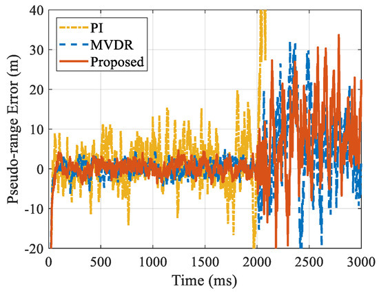 Figure 13 shows the pseudo-range error calculated by the software receiver. It can be clearly seen from the figure that the accuracy of the pseudo-range measurement processed by the proposed method and the MVDR method is better than that of the PI algorithm. Under the condition of a weak signal, the PI algorithm is unable to obtain effective pseudo-range measurement due to the lock-out of the signal tracking loop, which means that the observation output of the receiver is no longer available. Although the accuracy of the pseudo-range measurement obtained by the proposed method has decreased, it can still ensure the availability of the pseudo-range measurement. The above results show that the proposed method can achieve the same performance as MVDR.