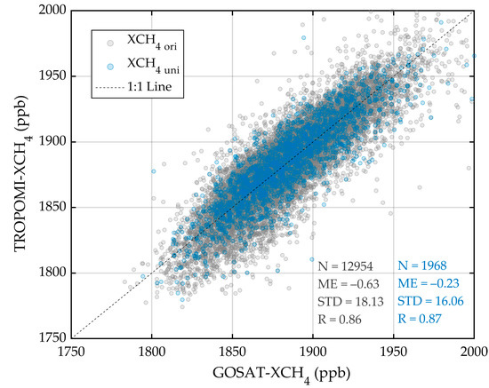 | Criteria of Data Screening | xCH4_quality_flag = 0, land_fraction > 90 | qa_value > 0.75 |