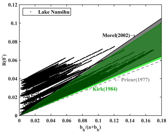 Figure 3. Irradiance reflectance just below the surface simulated with HydroLight as a function of b b / ( a + b b ) (N = 11,232) and the approximations of Prieur (1977) [1], Kirk (1984) [2], and Morel et al. (2002) [6] for the values of factor f (black dot, our results; 0.33, Prieur’s approach; green region, Kirk’s approach; grey region, Morel’s approach).