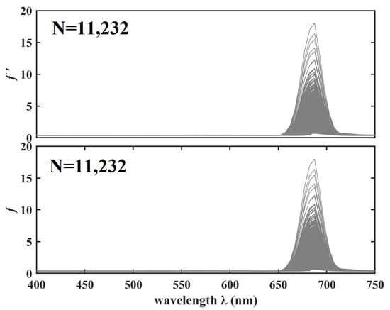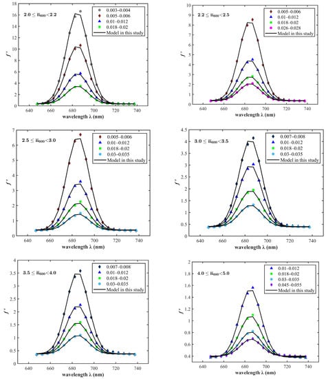 The spectrum of f and f was shown in Figure 4. The f and f values showed similar trends to f for 16 b ~ b p c values, 13 b ~ b p m values, and 2 bottom reflectances at 27 stations, a total of N = 11,232 (Figure 4). The coefficient f should be used if b b is not small with respect to a rather than the f factor. In this study, the backscattering coefficient b b at some stations was not small with respect to the absorption coefficient a due to the effect of particulate (Table 1); therefore, f was used rather than f [6,13]. The value f factor was relatively small at 400–650 nm, around 0.4, while there was a large change in f factor at 650–750 nm, with a maximum value approaching 18. Therefore, those situations were separated to study.