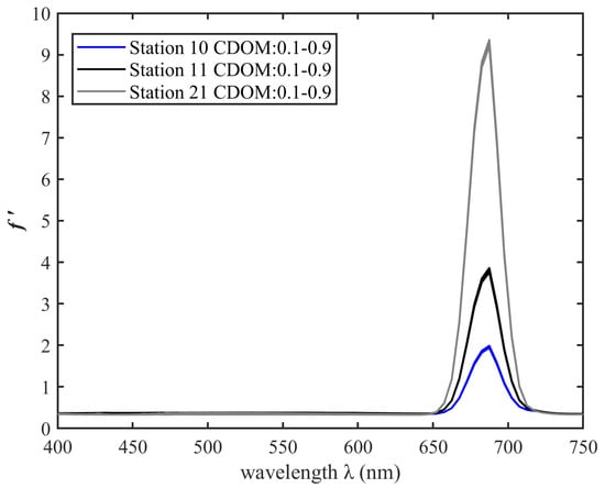 This study demonstrates that the f factor is a function of the solar zenith angle, n , and b ~ b p at various wavelengths under the condition of a C D O M ( 440   n m ) = 0.3 and two different bottom reflectances. It is necessary to discuss the effect of a C D O M and two bottom reflectances on the study the f factor. We investigated whether the concentration of CDOM had an impact on the study. Figure 8 shows the f spectra at three stations (Station 10, 11, and 21) with b ~ b p of 0.013, 0.01, and 0.0068, respectively. CDOM absorption ranged from 0.1 to 0.9 at an interval of 0.05 at 440 nm.