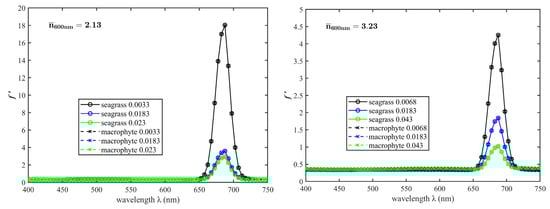 Likewise, the f values obtained for clean seagrass and macrophyte bottom reflectances are displayed in Figure 9 for various b ~ b p values. These had almost the same f factor values across various b ~ b p values under the same b ~ b p condition.